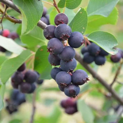 Ягоды у ирги Хонивуд округлые и крупные (диаметр от 16 до 18 мм). Они сине-лилового оттенка, с легким восковым налетом. Мякоть довольно сочная и мясистая. Плоды обладают медовым ароматом. Ягоды отличаются немного пряным, приторно сладким вкусом, который обусловлен очень низким содержанием фруктовой кислоты.